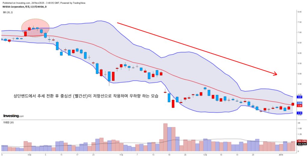 - 하단 밴드 터치: 단기 과매도 가능성. 하락 추세라면 약세 지속의 일부일 수도 있음.