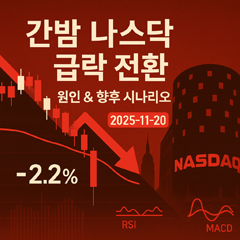 본 글은 교육 목적으로 작성되었으며, 투자 권유가 아닙니다. 과거 사례나 가정은 미래 수익을 보장하지 않습니다. 한눈에 보기 지수 마감 요약 (미 동부 2025-11-24) 지수 등락(%) 종가 Nasdaq Composite +2.7% 22,872.01 S&P 500 +1.5% 6,705.12 Dow Jones +0.4% 46,448.27 Russell 2000 +1.9% 2,414.28 급등의 핵심 동력 1) 금리 기대의 변화 2) 더보기